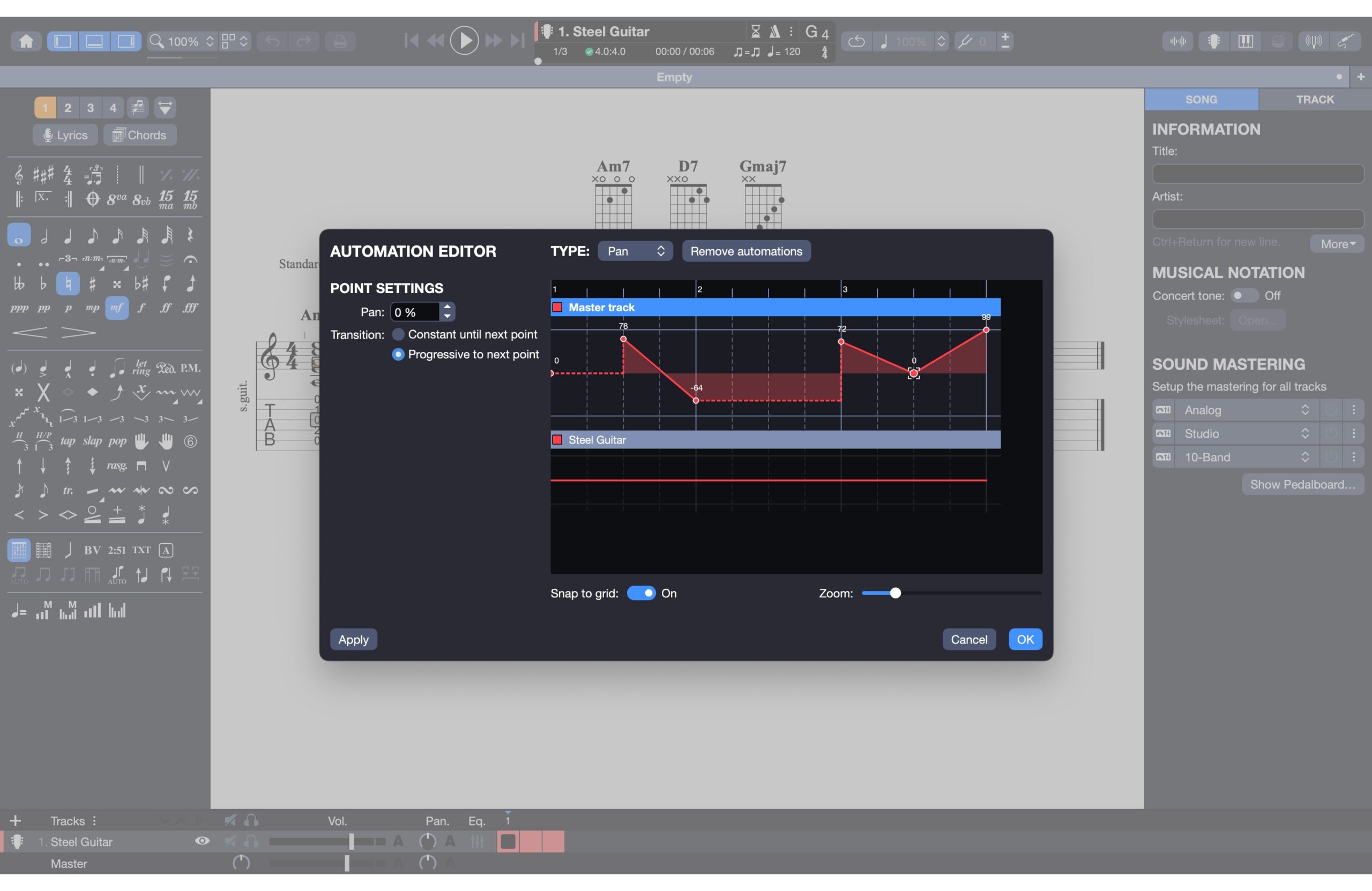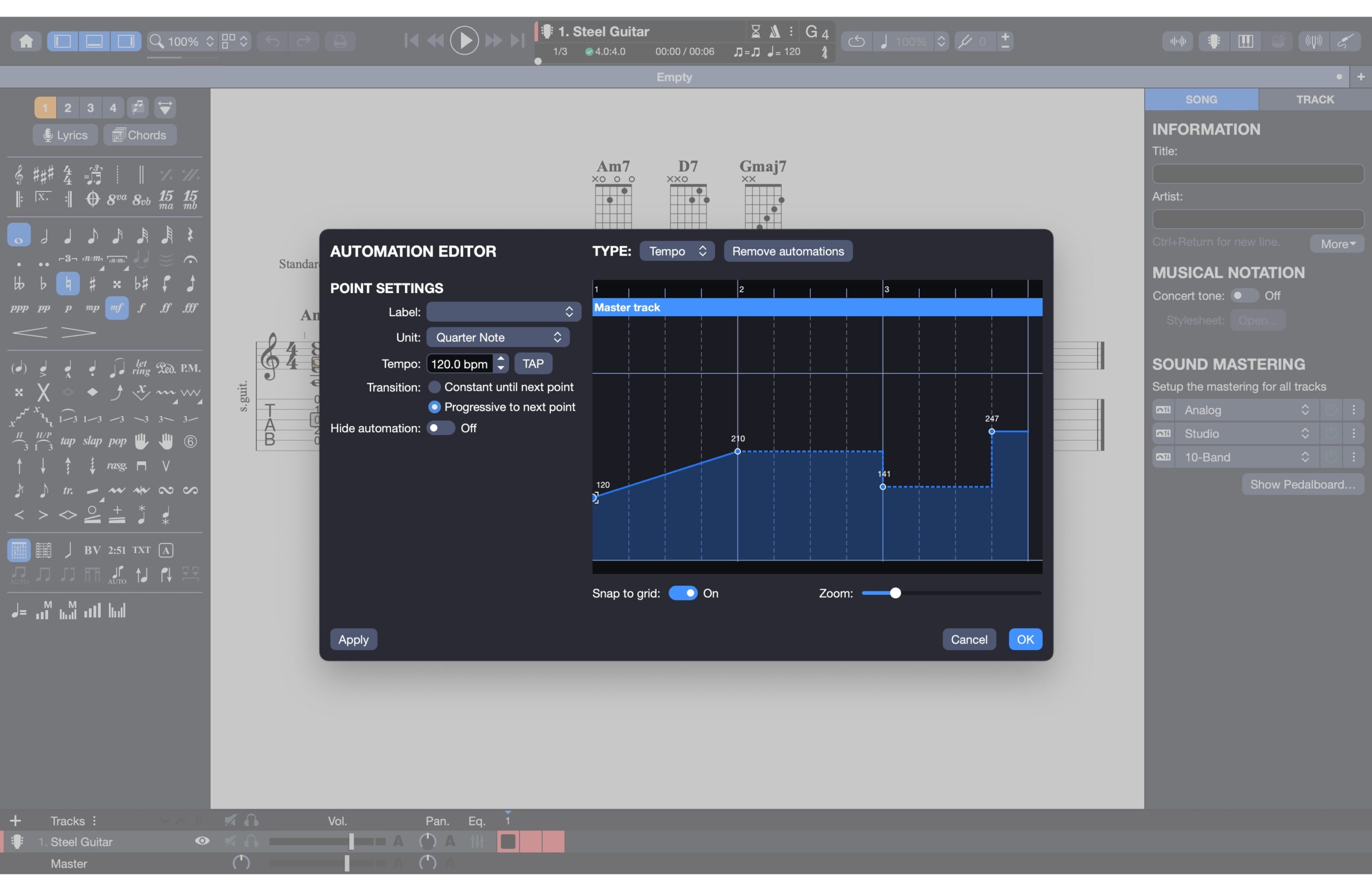 Pour ces 3 options, il est possible de choisir entre une transition constante (par exemple pour passer de 80 BPM à 120 BPM à la mesure suivante) et une transition progressive, plus naturelle.